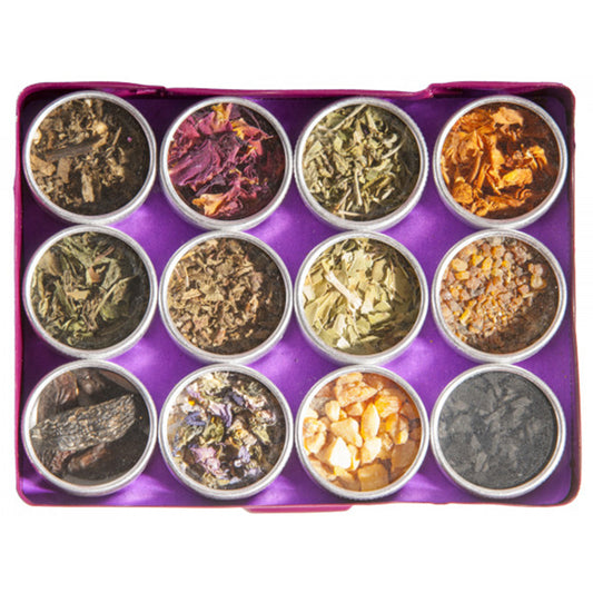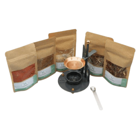 Räuchersortiment Liebe und Glück (12 Döschen in Box) mit Räuchergefäß Konus incl. Kupferlöffel
